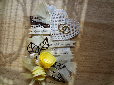 Sezon ślubny w pełni. Zmagam się więc z karteczkami o tej tematyce. Dziś coś w kolorze czekolady. Docelowo kartka jest przeznaczona dla mojego Brata i przyszłej Bratowej, dla nich też kiedyś robiłam zaproszenia. Nie ma więc w doborze materiałów zbytniej przypadkowości. Korzystając z tego, które zaproszenia z zaproponowanych wybrali, poszłam tym tropem i stanęło na modnej obecnie koronce w kolorze ciemnej czekolady. Obawiałam się troszkę czy nie będzie smutno, ale chyba jest ok. Dziękuję także Basi, na której pracy się odrobinę wzorowałam ;)